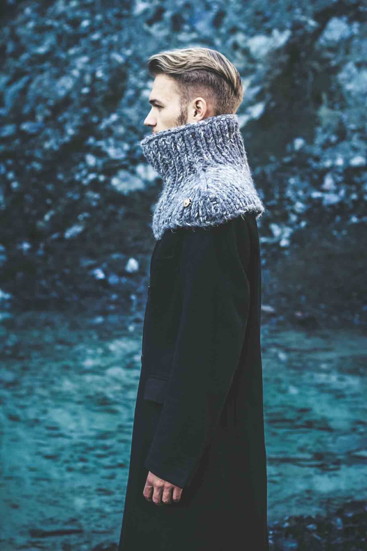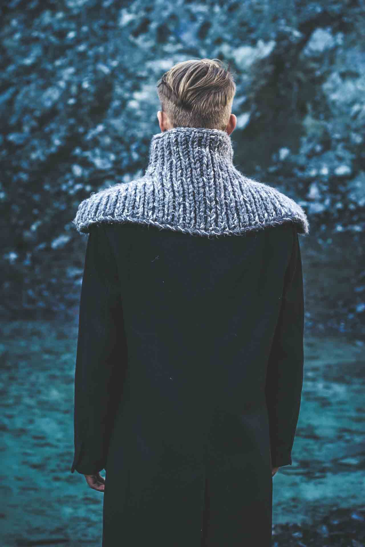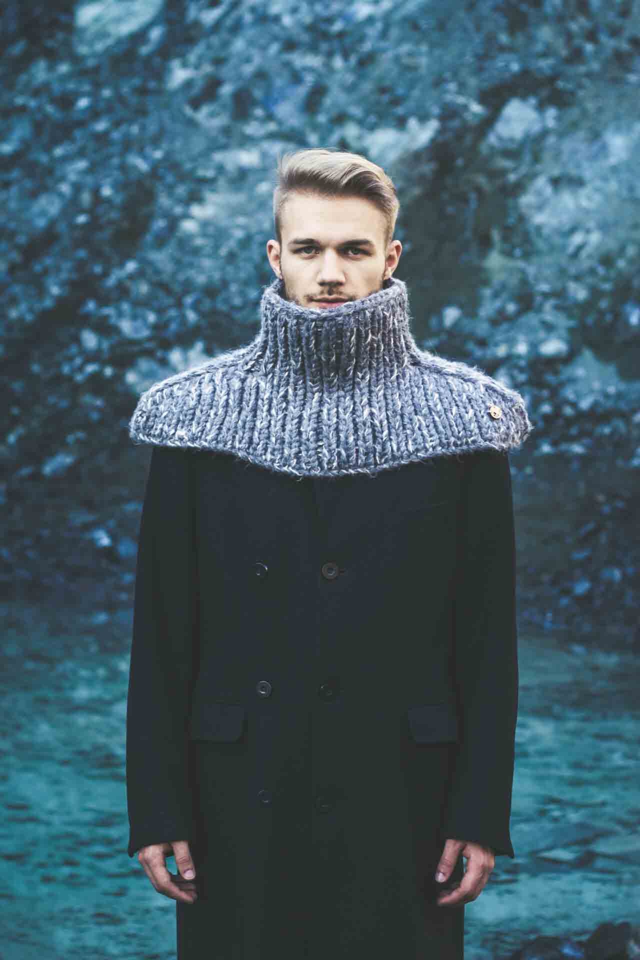 SUPERHERO is specially and precisely designed scarf of unique form, made as the blend of fine natural wools and other natural fibres spun together in a bulky yarn. Idea for this scarf came as the response for the cold, windy winter. The person who wears this scarf easily tucks in when the snow falls heavily or the wind howls, while the extended bottom part protects the shoulders, chest and upper back part, which are extremely sensitive to cold. It could be worn over or under the coat. It is also inspired by the popular Japanese anime culture, while the principles of production and materials are entirely traditional.