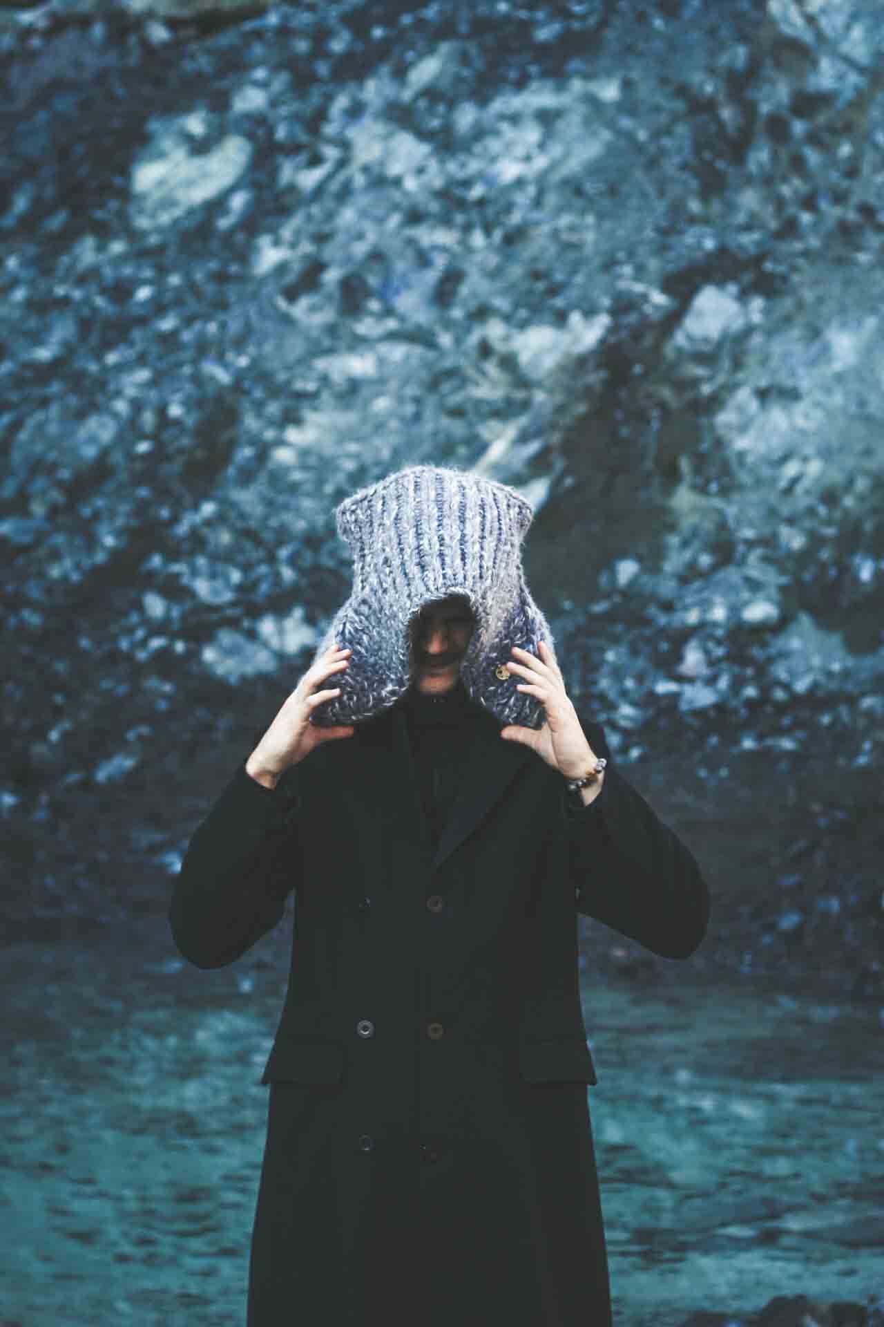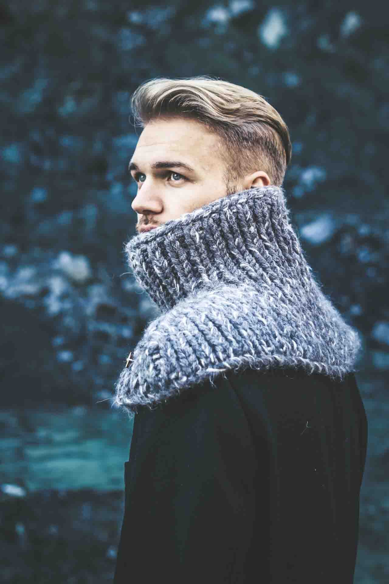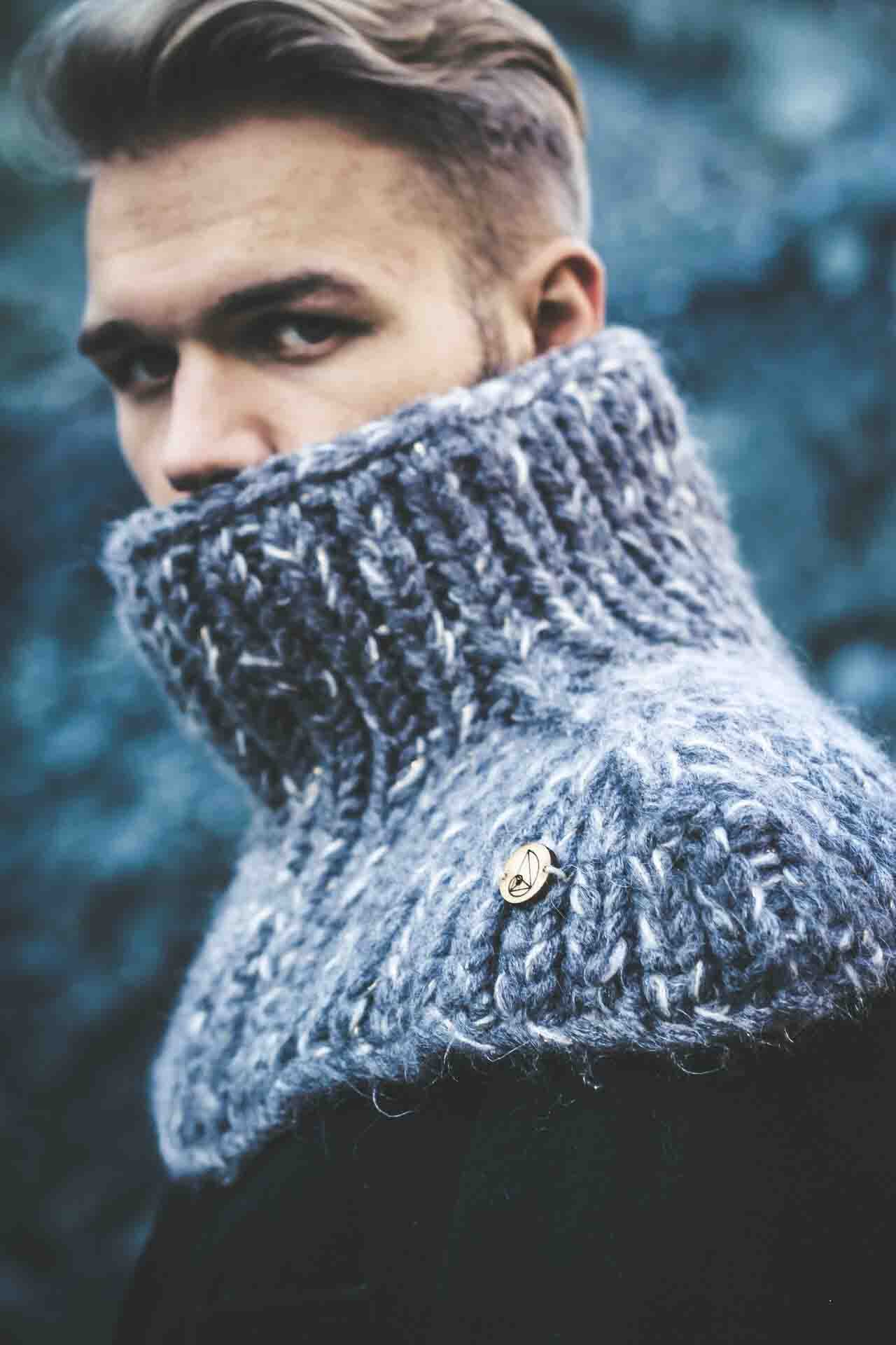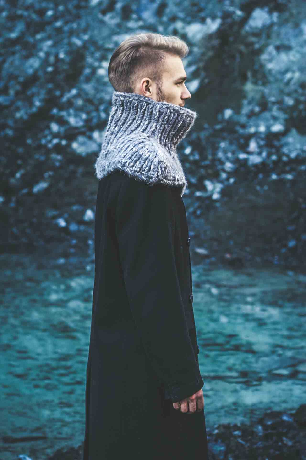 SUPERHERO is specially and precisely designed scarf of unique form, made as the blend of fine natural wools and other natural fibres spun together in a bulky yarn. Idea for this scarf came as the response for the cold, windy winter. The person who wears this scarf easily tucks in when the snow falls heavily or the wind howls, while the extended bottom part protects the shoulders, chest and upper back part, which are extremely sensitive to cold. It could be worn over or under the coat. It is also inspired by the popular Japanese anime culture, while the principles of production and materials are entirely traditional.